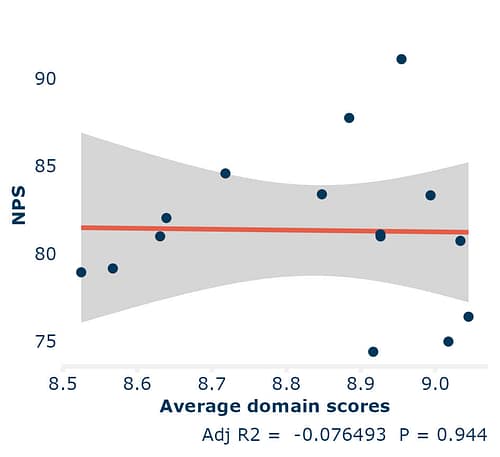 In the image above we use data from 111 facilities across three continents and multiple surveys, where the questions cover all key domains of care, and the average of the domain scores is closely correlated with NPS.