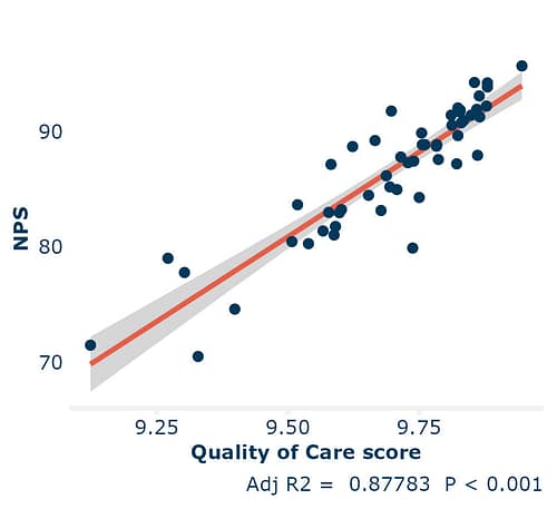 Across our surveys, we see a tight correlation between NPS and overall Quality of Care ratings. Even when we switch out NPS for “Quality of Care” in Key Driver Analysis, the same themes emerge as the biggest influences on patient experiences.